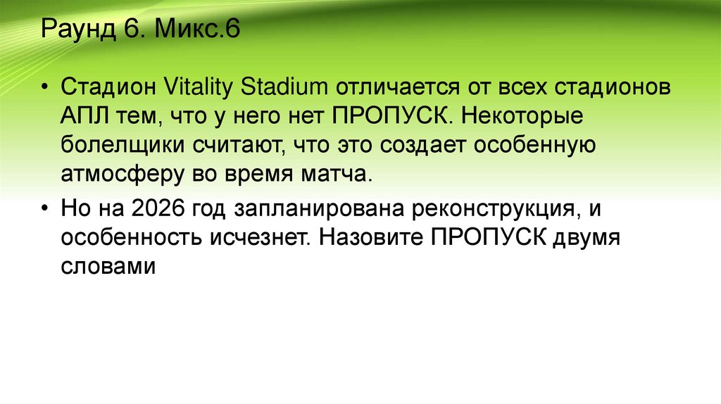 Раунд 6. Микс.6• Стадион Vitality Stadium отличается от всех стадионов