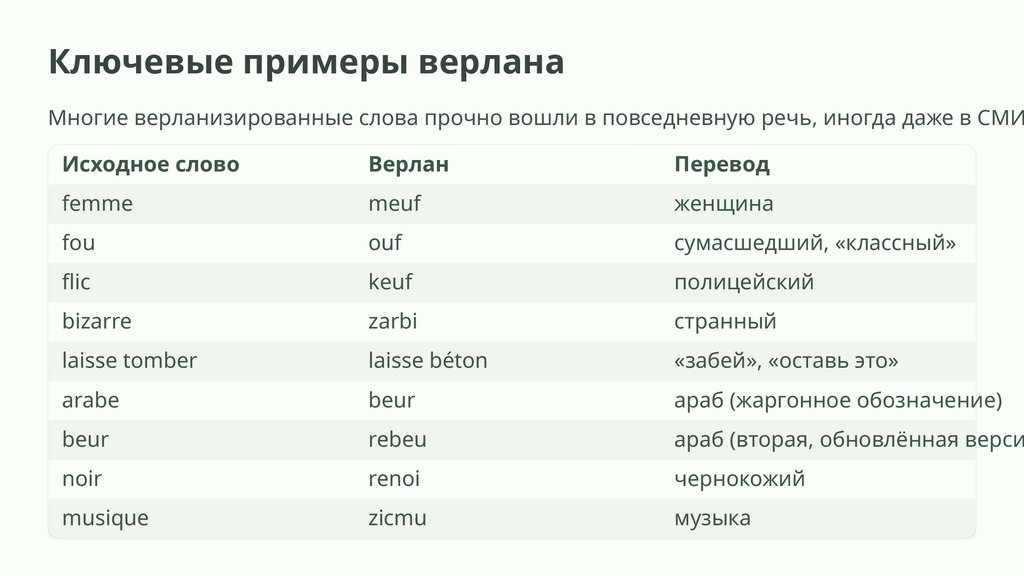 Ключевые примеры верланаМногие верланизированные слова прочно вошли в повседневную речь, иногда даже в СМИ