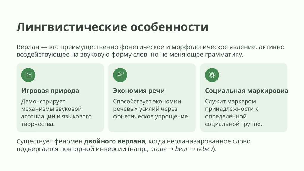 Лингвистические особенностиВерлан — это преимущественно фонетическое и морфологическое явление, активно