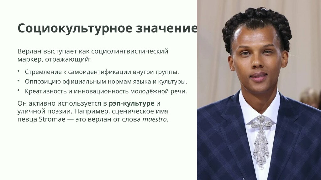 Социокультурное значениеВерлан выступает как социолингвистический