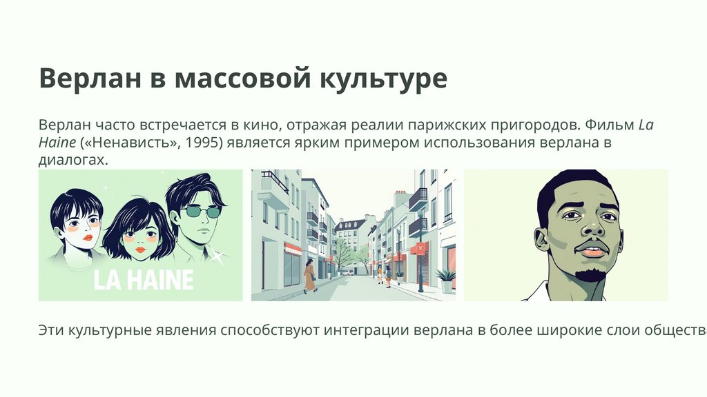 Эти культурные явления способствуют интеграции верлана в более широкие слои общества