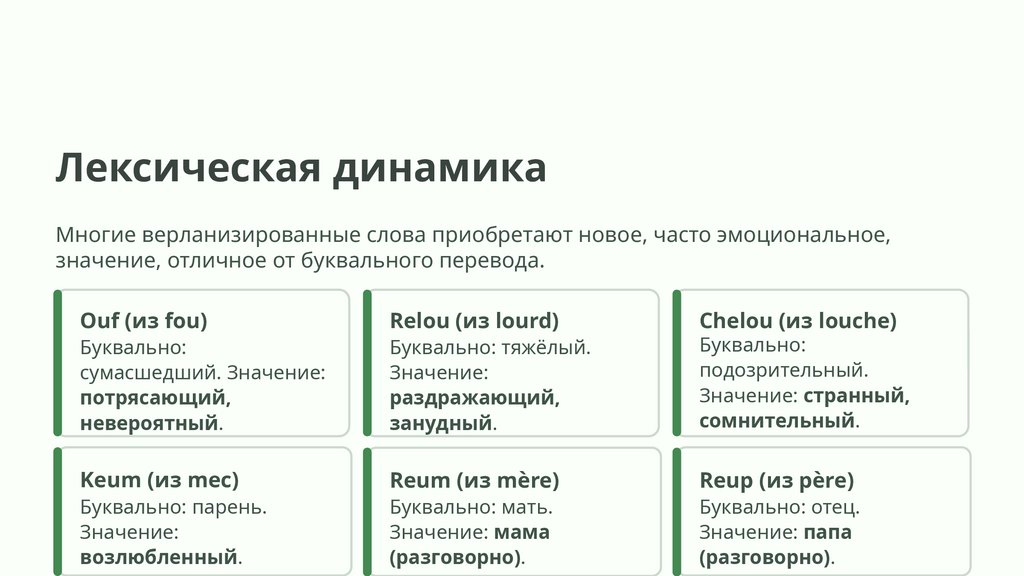 Лексическая динамикаМногие верланизированные слова приобретают новое, часто эмоциональное,