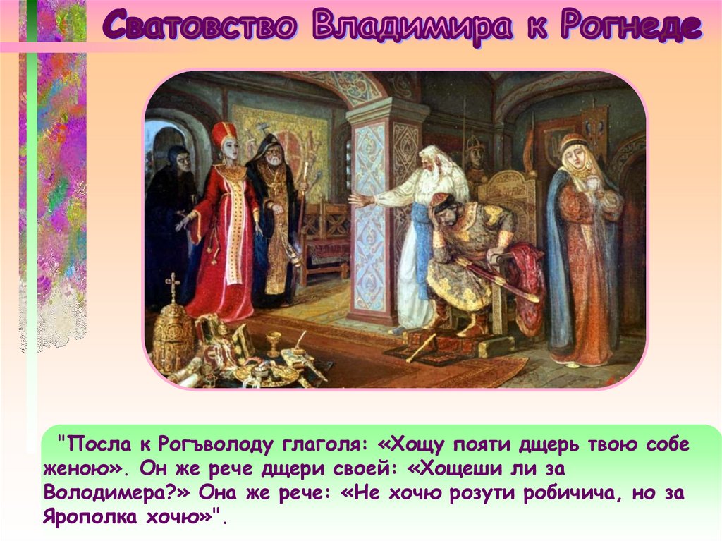 "Посла к Рогъволоду глаголя: «Хощу пояти дщерь твою собеженою». Он же рече дщери своей: «Хощеши ли за