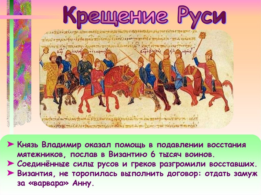 Князь Владимир оказал помощь в подавлении восстаниямятежников, послав в Византию 6 тысяч воинов.