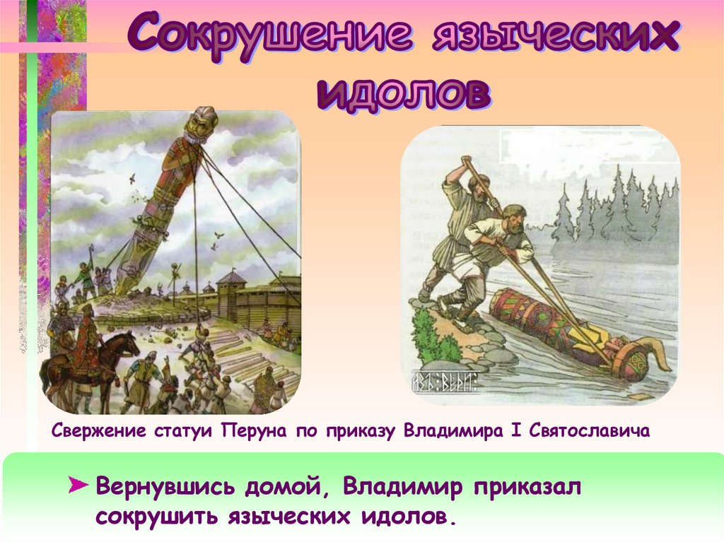 Свержение статуи Перуна по приказу Владимира I СвятославичаВернувшись домой, Владимир приказал