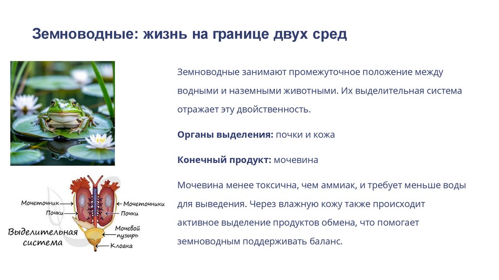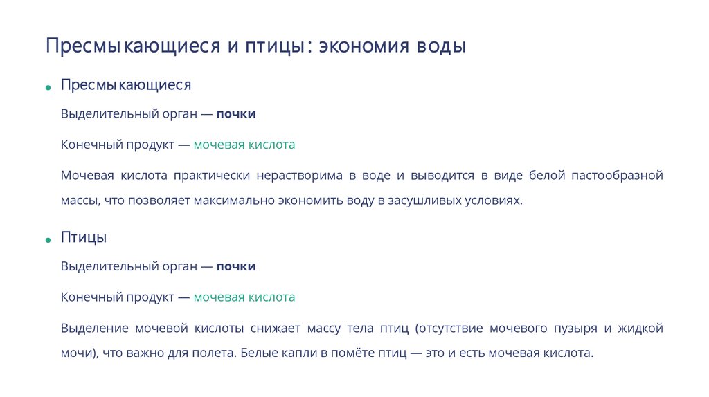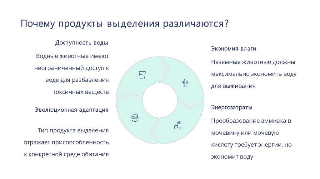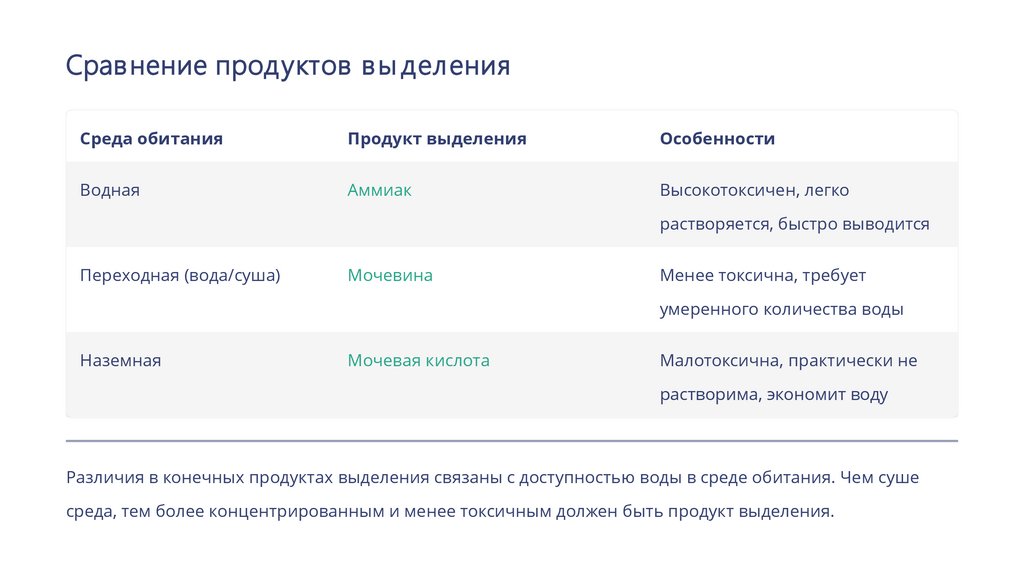 Различия в конечных продуктах выделения связаны с доступностью воды в среде обитания. Чем суше