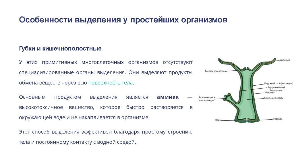 Особенности выделения у простейших организмовГубки и кишечнополостные