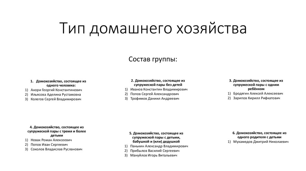 Состав членов домохозяйства, родственные связи между ними;Возраст, пол, род деятельности и уровень дохода каждого члена;