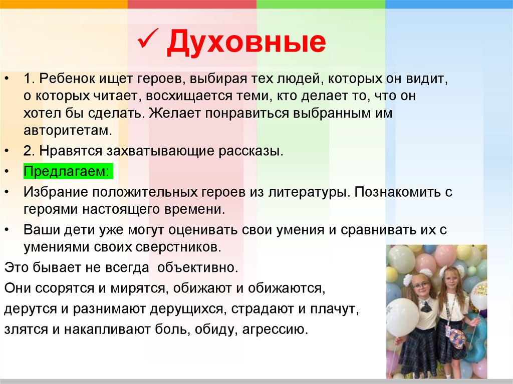 Духовные• 1. Ребенок ищет героев, выбирая тех людей, которых он видит,