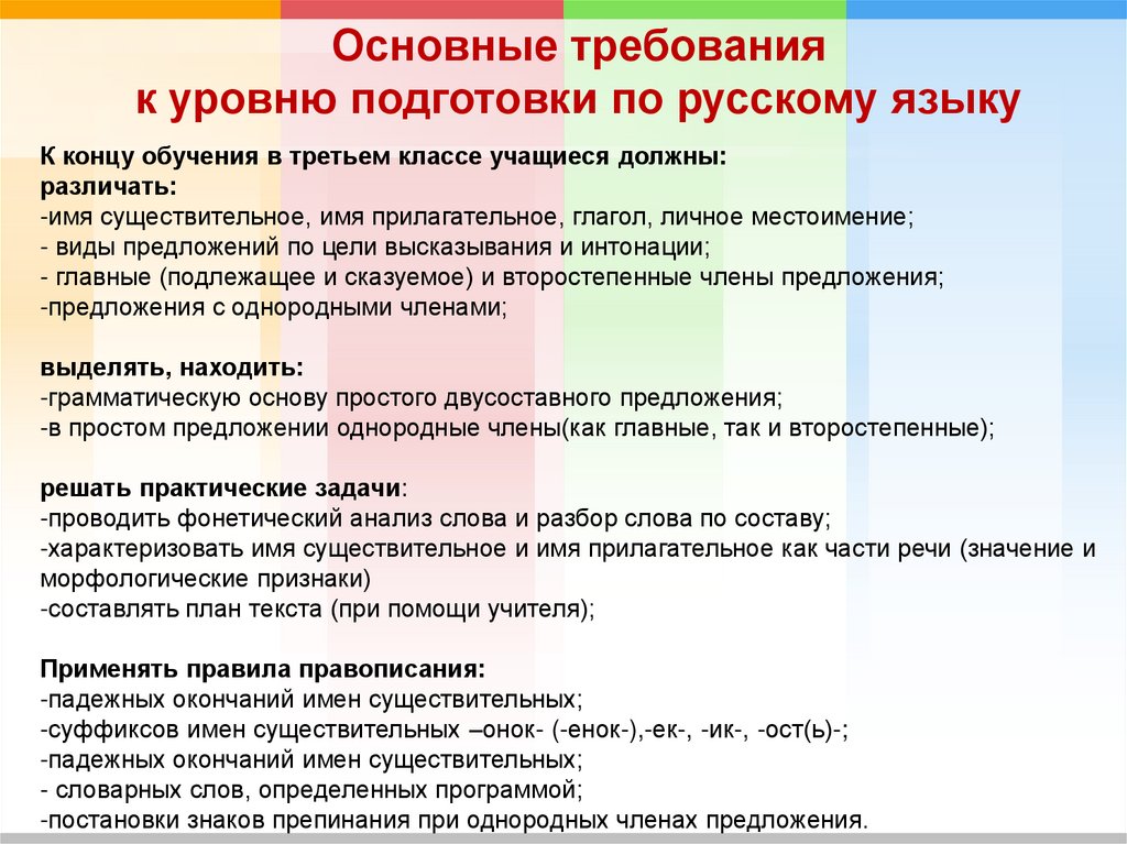 Основные требованияк уровню подготовки по русскому языку