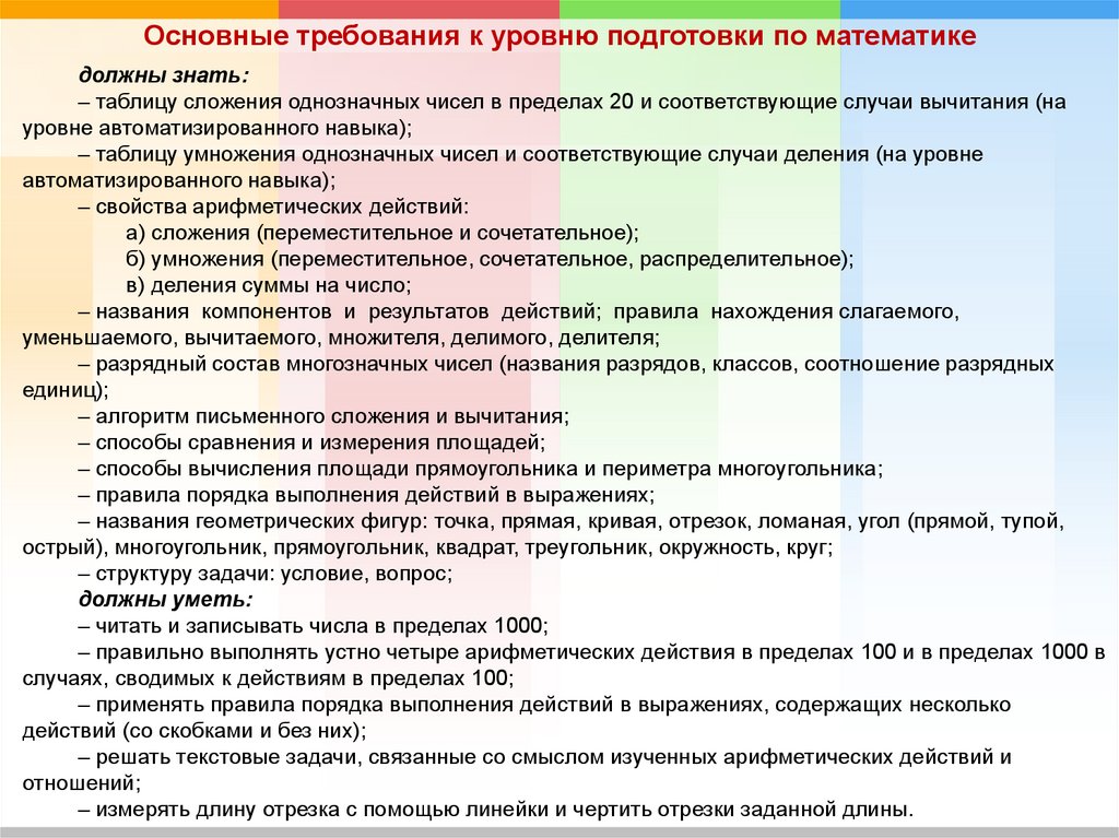 Основные требования к уровню подготовки по математикедолжны знать: