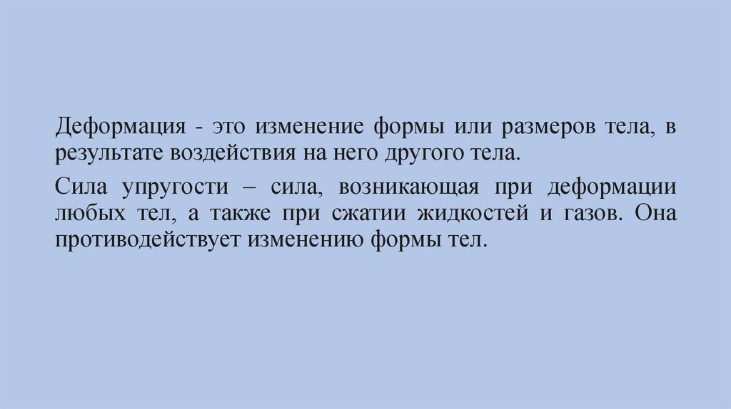 Деформация - это изменение формы или размеров тела, врезультате воздействия на него другого тела.