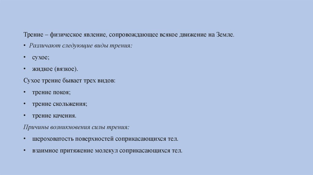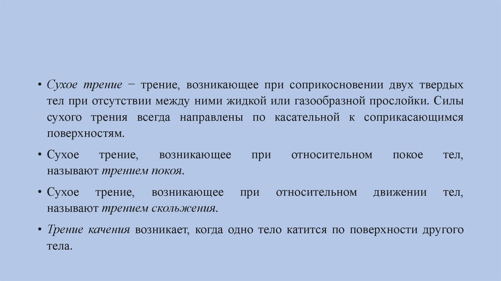 • Сухое трение − трение, возникающее при соприкосновении двух твердыхтел при отсутствии между ними жидкой или газообразной прослойки. Силы