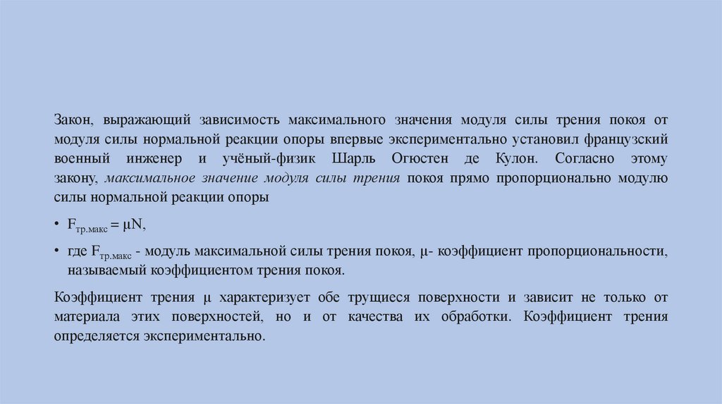 Закон, выражающий зависимость максимального значения модуля силы трения покоя отмодуля силы нормальной реакции опоры впервые экспериментально установил французский