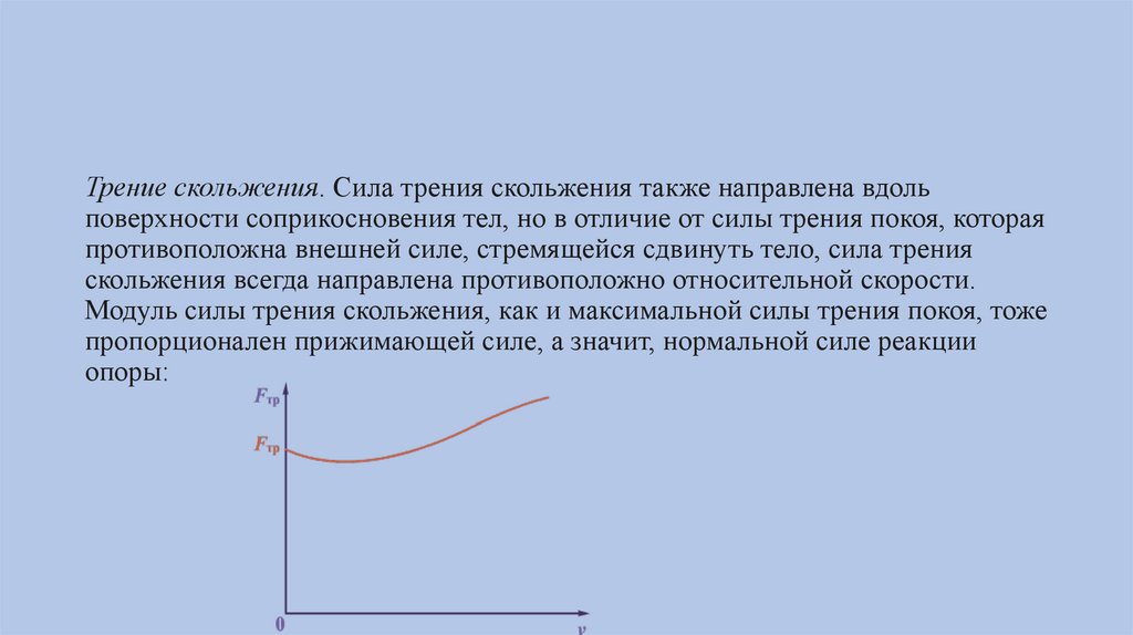 Трение скольжения. Сила трения скольжения также направлена вдольповерхности соприкосновения тел, но в отличие от силы трения покоя, которая