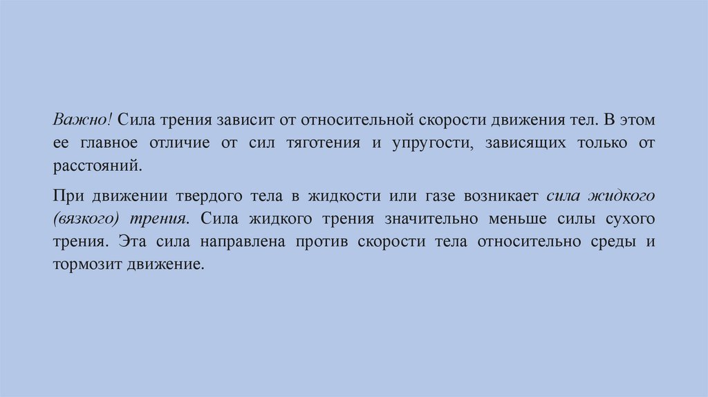 Важно! Сила трения зависит от относительной скорости движения тел. В этомее главное отличие от сил тяготения и упругости, зависящих только от
