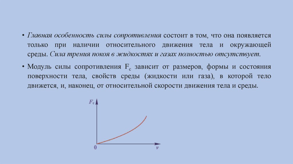 • Главная особенность силы сопротивления состоит в том, что она появляетсятолько при наличии относительного движения тела и окружающей