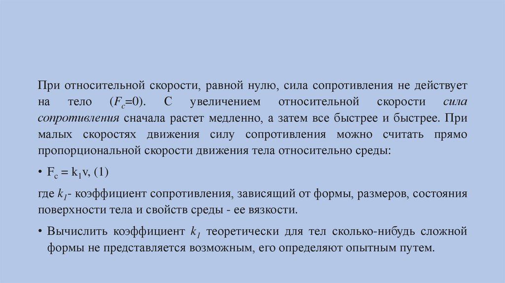 • Модуль силы сопротивления Fc зависит от размеров, формы и состояния