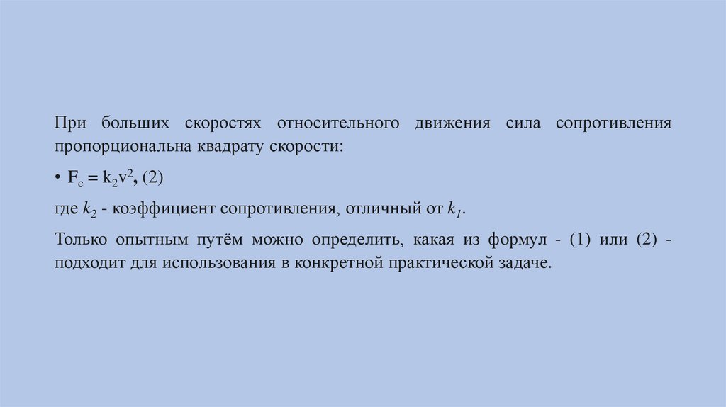 При больших скоростях относительного движения сила сопротивленияпропорциональна квадрату скорости: