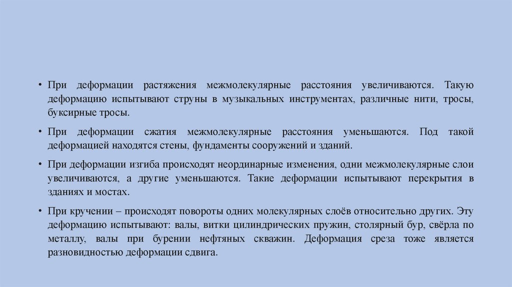 • При деформации растяжения межмолекулярные расстояния увеличиваются. Такуюдеформацию испытывают струны в музыкальных инструментах, различные нити, тросы,
