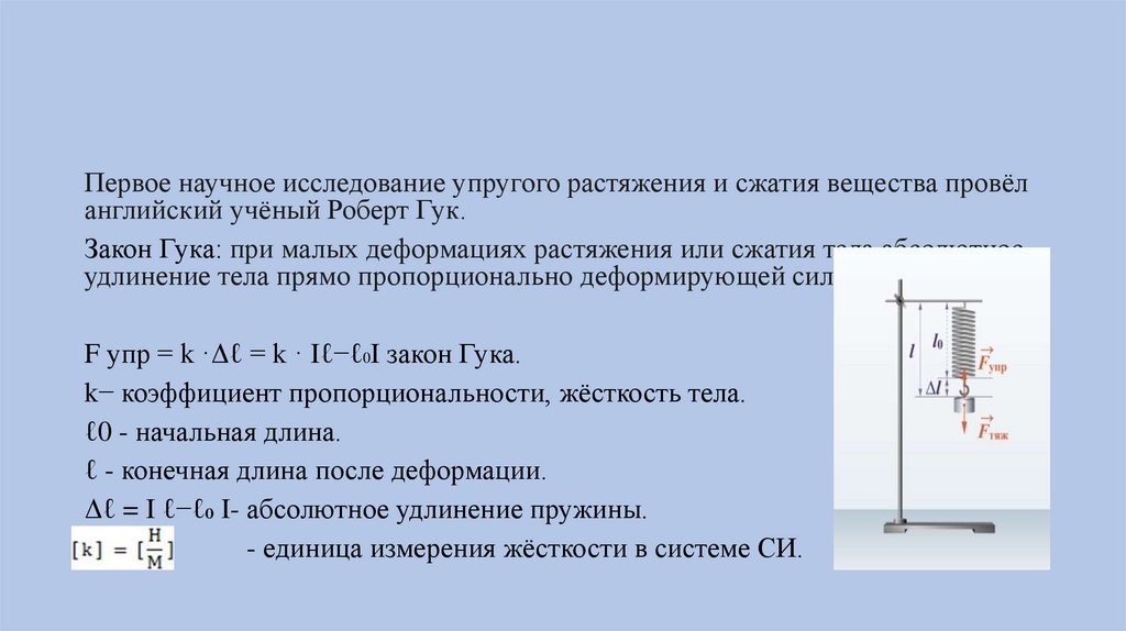 Первое научное исследование упругого растяжения и сжатия вещества провёланглийский учёный Роберт Гук.