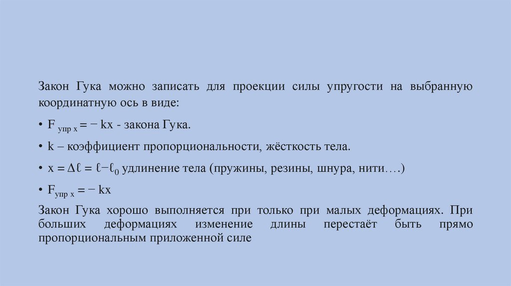 Закон Гука можно записать для проекции силы упругости на выбраннуюкоординатную ось в виде: