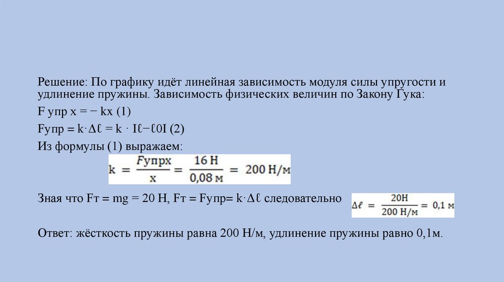 Решение: По графику идёт линейная зависимость модуля силы упругости иудлинение пружины. Зависимость физических величин по Закону Гука: