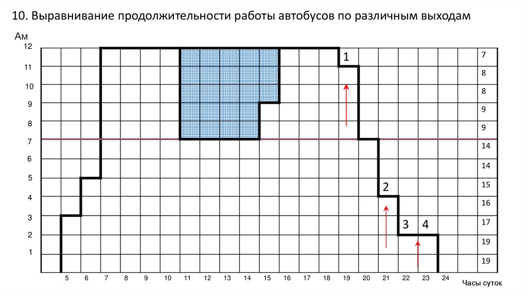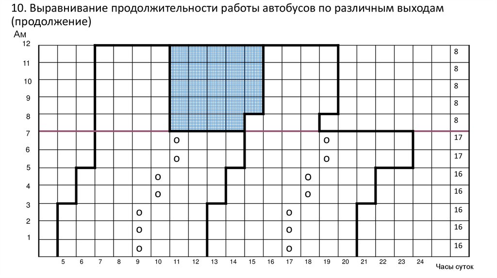 Количество автобусов, работающих на маршруте, интервал движения по часам суток.