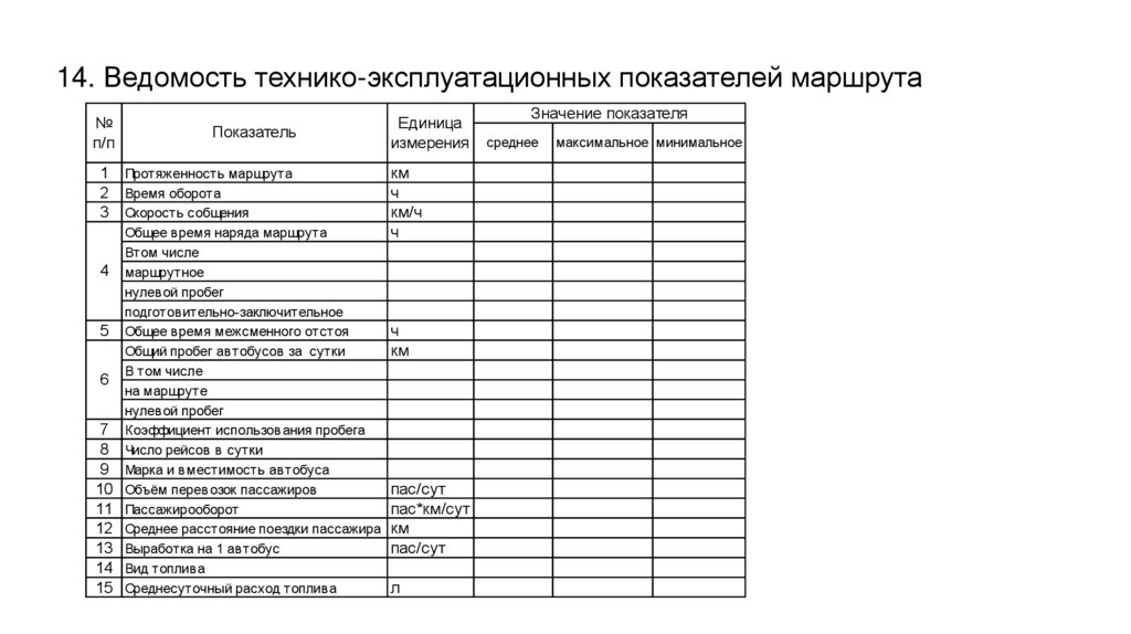 14. Ведомость технико-эксплуатационных показателей маршрута№
