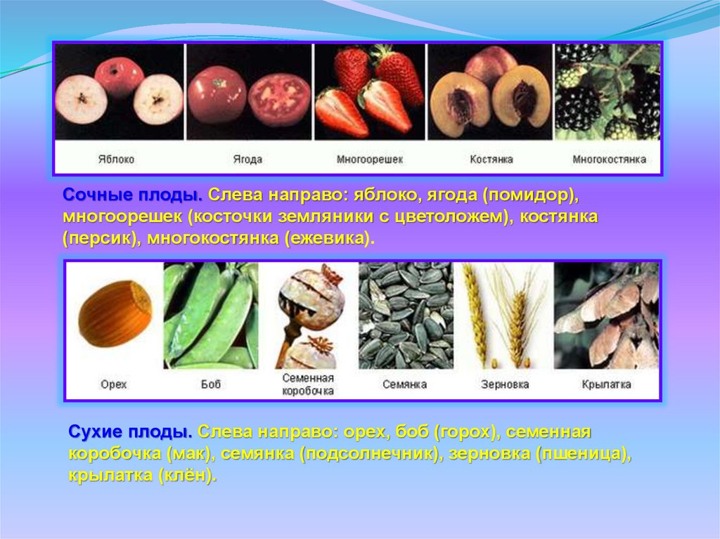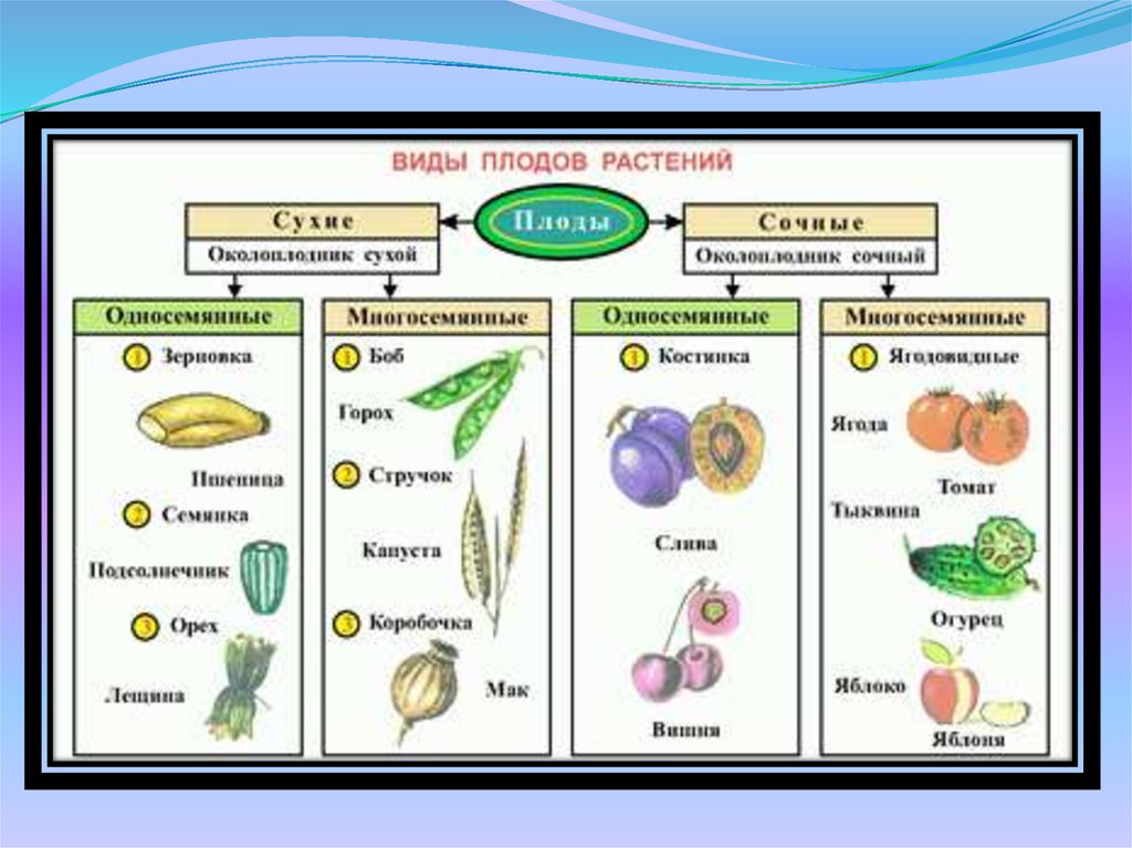 коробочка (мак), семянка (подсолнечник), зерновка (пшеница),