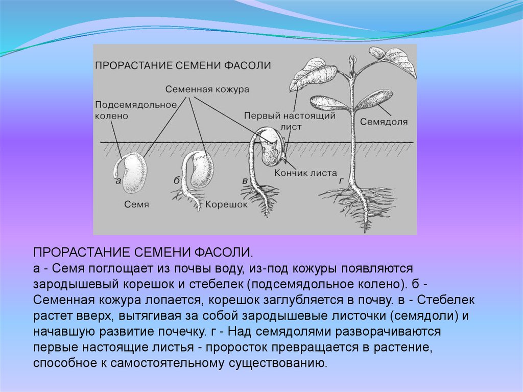 ПРОРАСТАНИЕ СЕМЕНИ ФАСОЛИ.а - Семя поглощает из почвы воду, из-под кожуры появляются