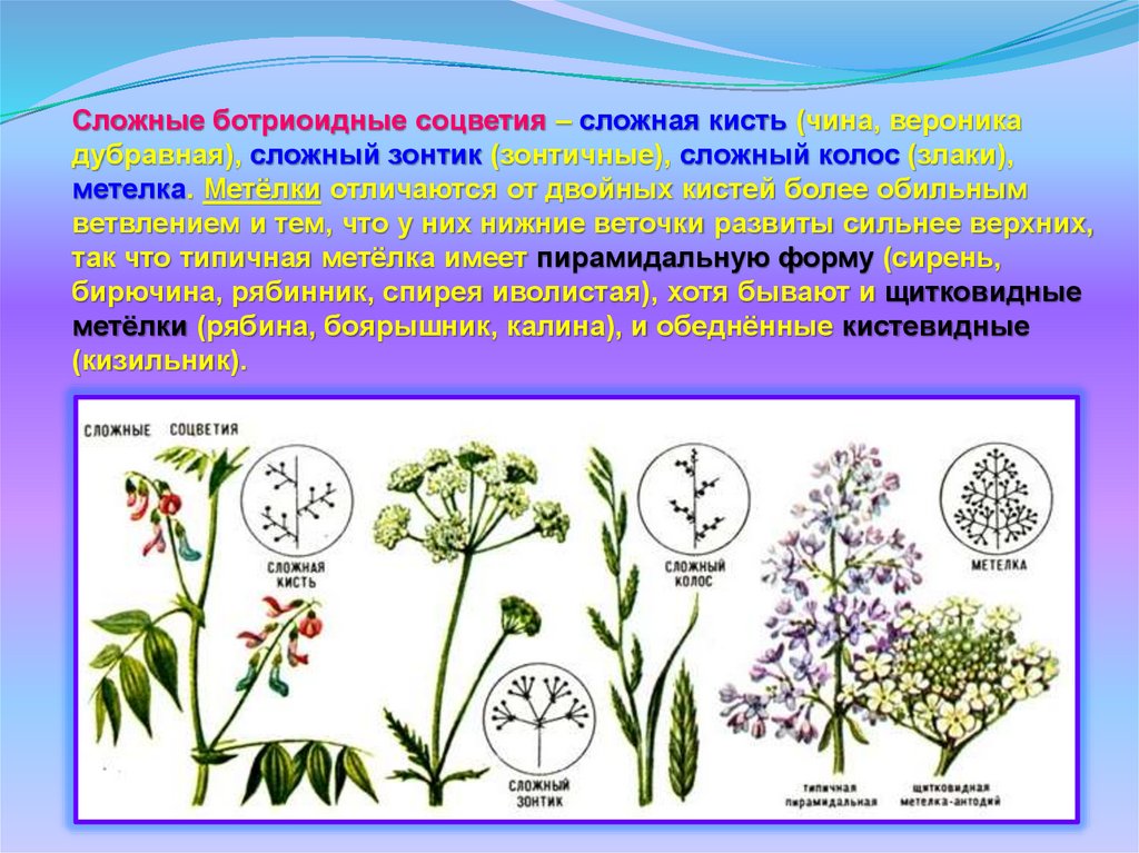 Сложные ботриоидные соцветия – сложная кисть (чина, вероникадубравная), сложный зонтик (зонтичные), сложный колос (злаки),