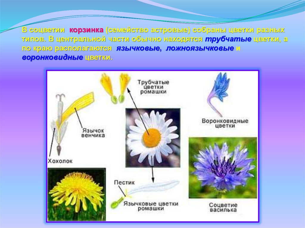 В соцветии корзинка (семейство астровые) собраны цветки разныхтипов. В центральной части обычно находятся трубчатые цветки, а