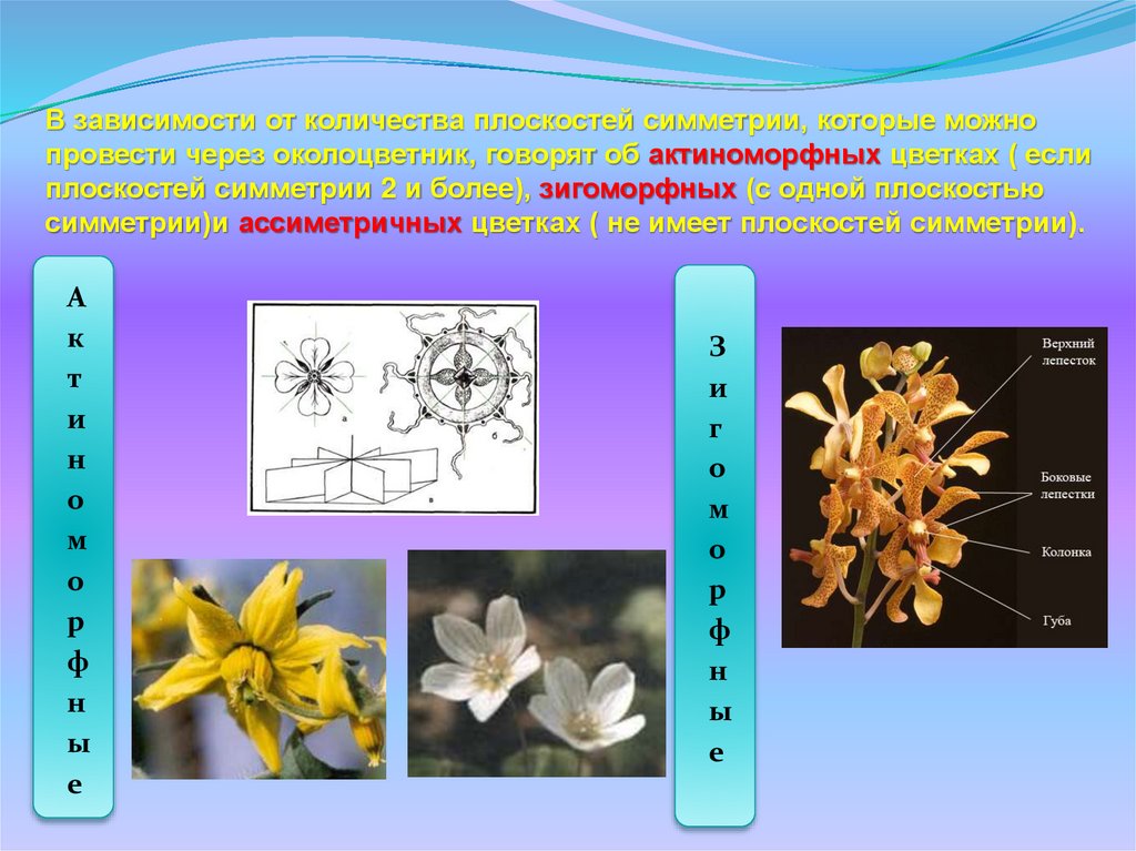 симметрии)и ассиметричных цветках ( не имеет плоскостей симметрии).
