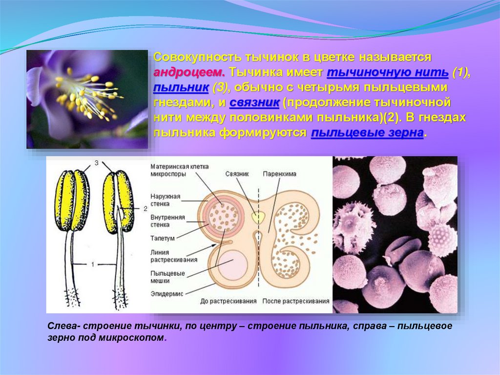 Слева- строение тычинки, по центру – строение пыльника, справа – пыльцевое