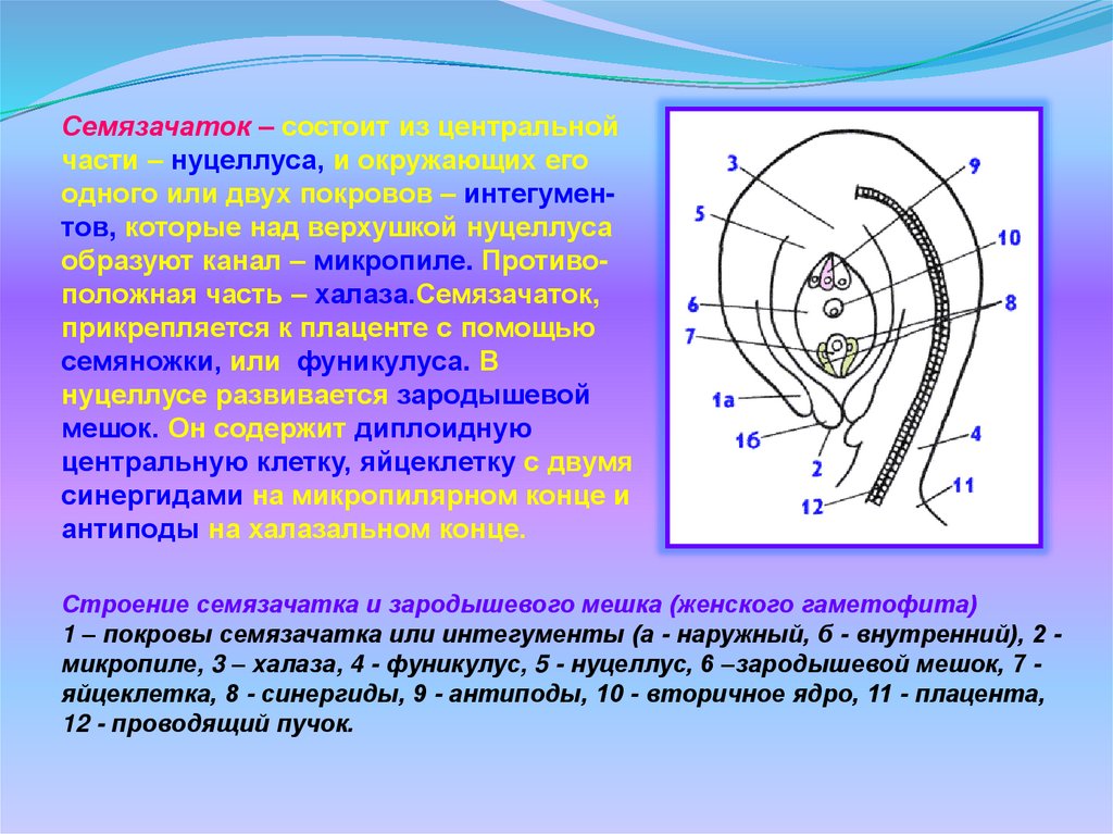 1 – покровы семязачатка или интегументы (а - наружный, б - внутренний), 2 микропиле, 3 – халаза, 4 - фуникулус, 5 - нуцеллус, 6 –зародышевой мешок, 7 яйцеклетка, 8 - синергиды, 9 - антиподы, 10 - вторичное ядро, 11 - плацента,