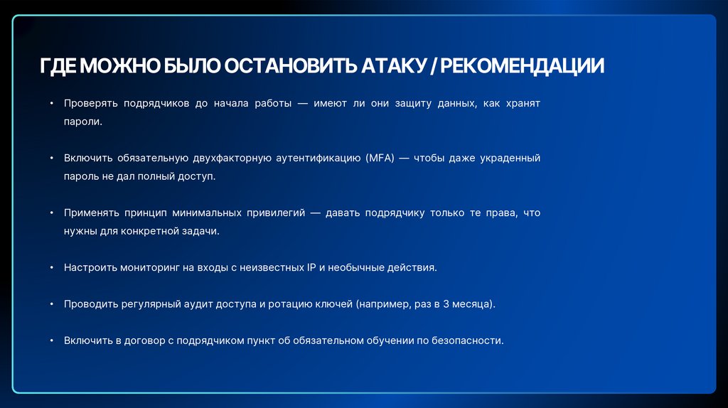 ГДЕ МОЖНО БЫЛО ОСТАНОВИТЬ АТАКУ / РЕКОМЕНДАЦИИ• Проверять подрядчиков до начала работы — имеют ли они защиту данных, как хранят