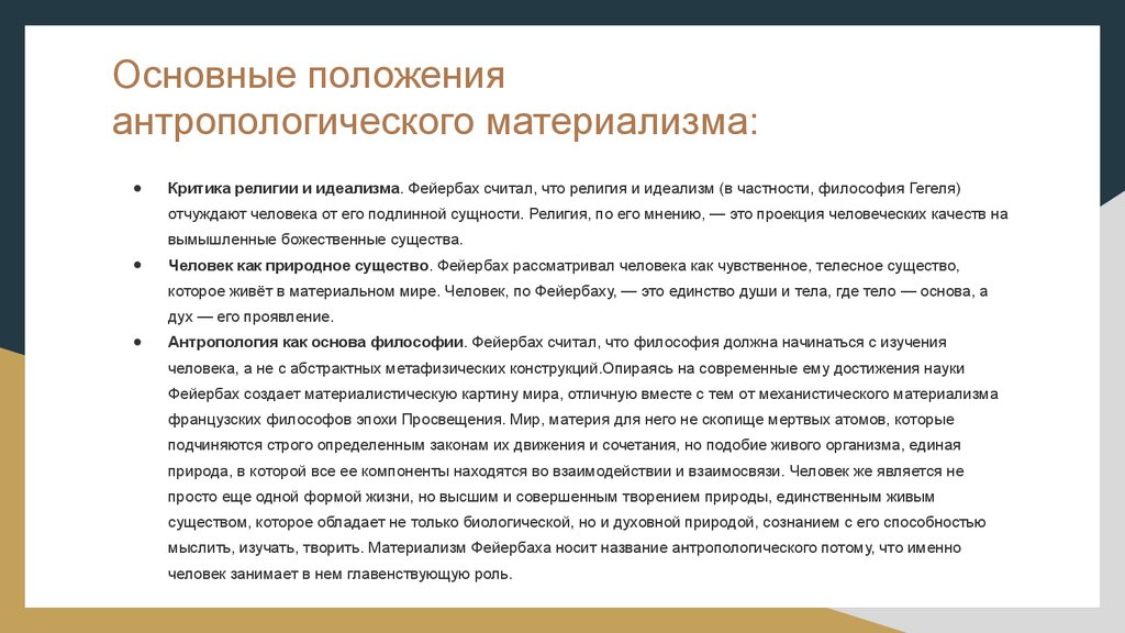 мыслить, изучать, творить. Материализм Фейербаха носит название антропологического потому, что именно