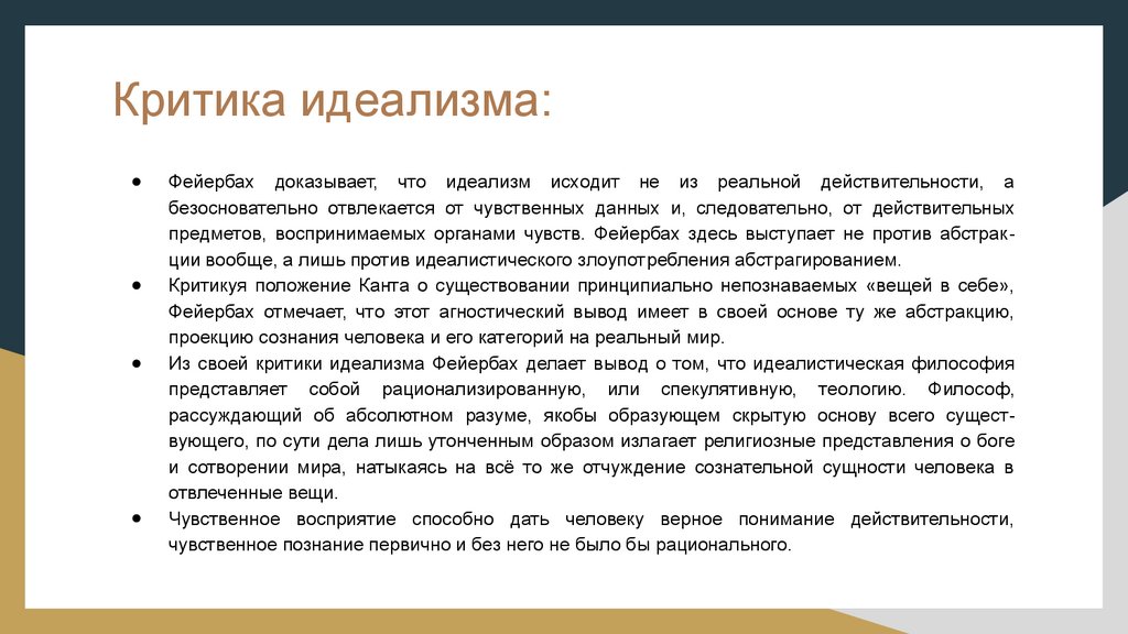 Критика идеализма:Фейербах доказывает, что идеализм исходит не из реальной действительности, а