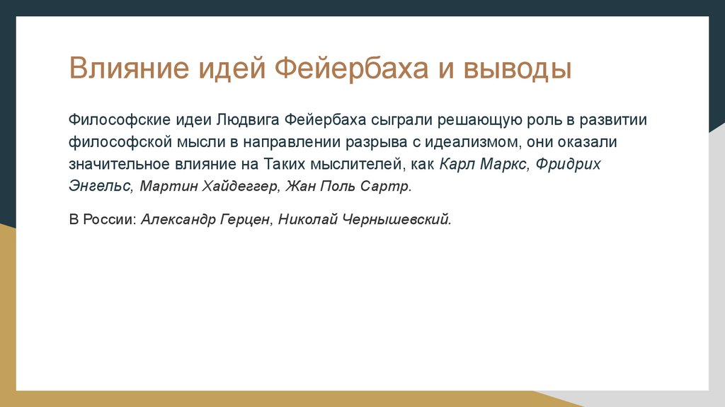 Влияние идей Фейербаха и выводыФилософские идеи Людвига Фейербаха сыграли решающую роль в развитии