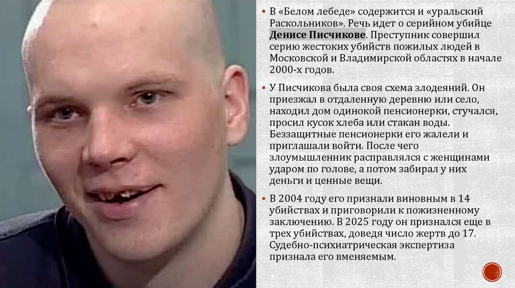 В «Белом лебеде» содержится и «уральскийРаскольников». Речь идет о серийном убийце