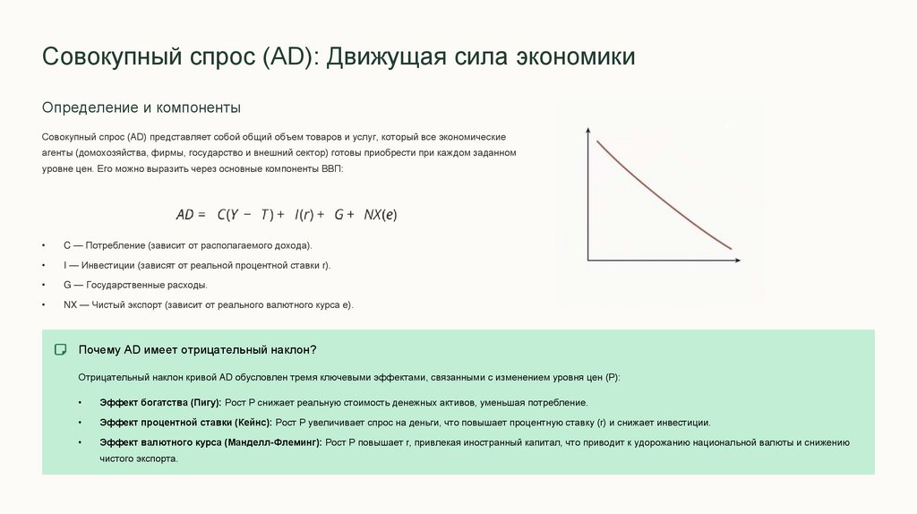 Отрицательный наклон кривой AD обусловлен тремя ключевыми эффектами, связанными с изменением уровня цен (P):