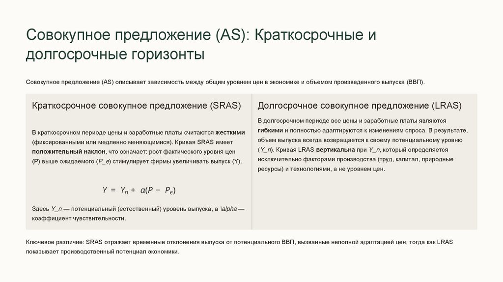 Ключевое различие: SRAS отражает временные отклонения выпуска от потенциального ВВП, вызванные неполной адаптацией цен, тогда как LRAS