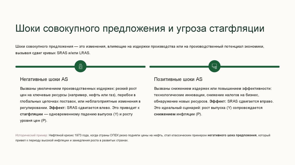 Исторический пример: Нефтяной кризис 1973 года, когда страны ОПЕК резко подняли цены на нефть, стал классическим примером негативного шока предложения, который