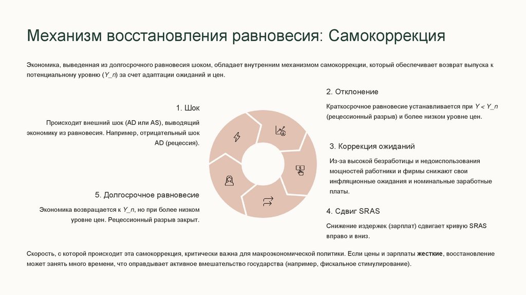 Механизм восстановления равновесия: СамокоррекцияЭкономика, выведенная из долгосрочного равновесия шоком, обладает внутренним механизмом самокоррекции, который обеспечивает возврат выпуска к