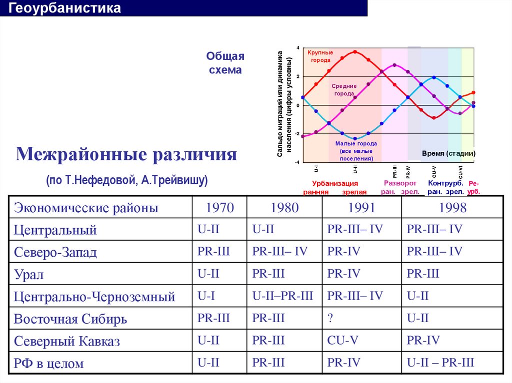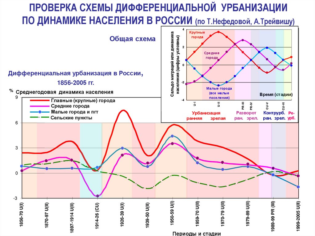 ГеоурбанистикаСтадии “дифференциальной урбанизации” в России, 1856-1999 гг.