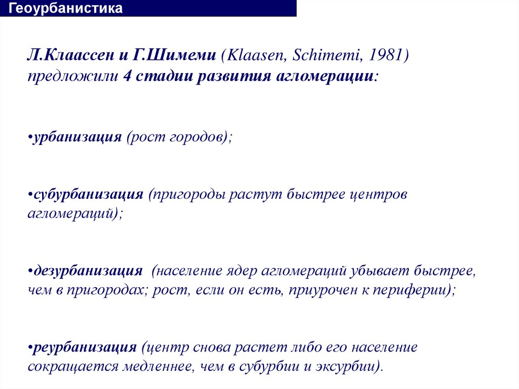 26. СТАДИИ РАЗВИТИЯ ГОРОДСКИХ АГЛОМЕРАЦИЙ по Л.Клаассену и Г.Шимеми