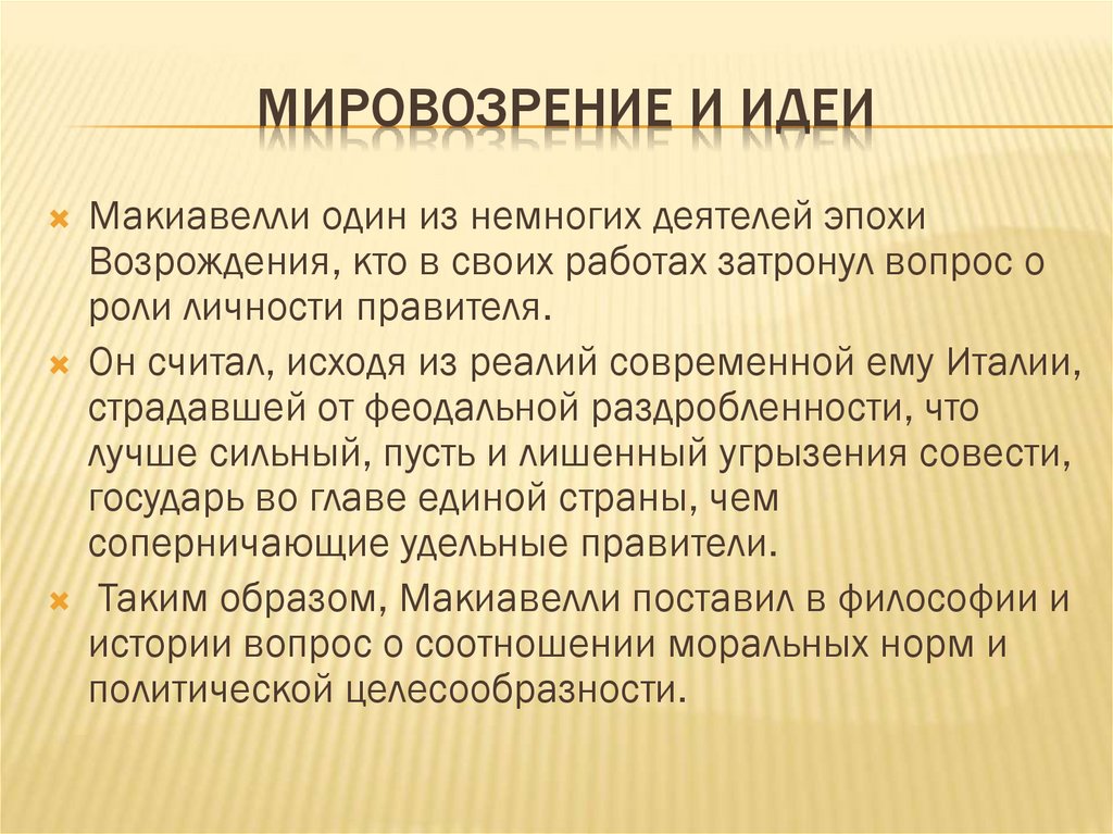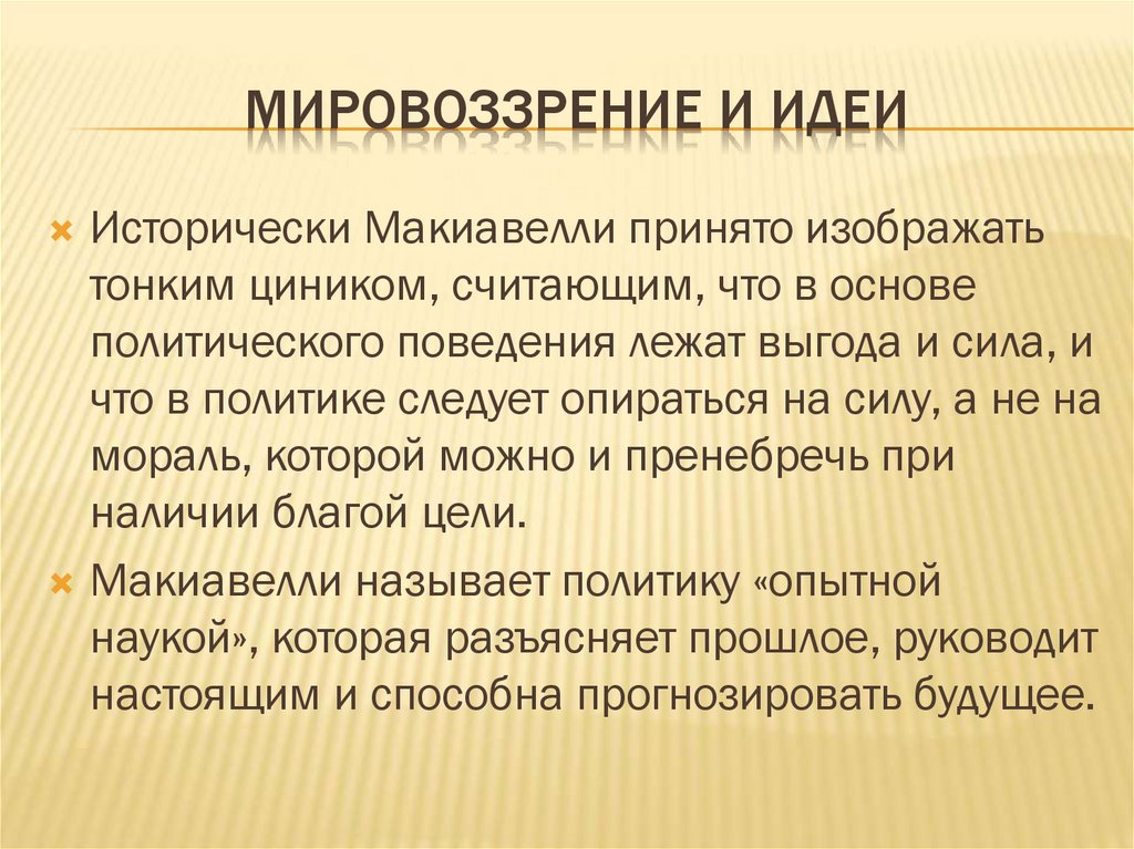 МИРОВОЗЗРЕНИЕ И ИДЕИИсторически Макиавелли принято изображать