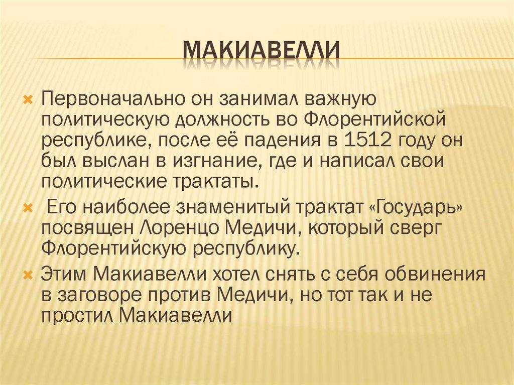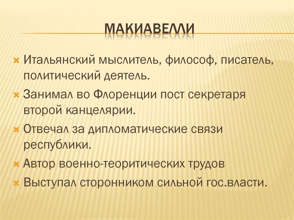 МАКИАВЕЛЛИПервоначально он занимал важную