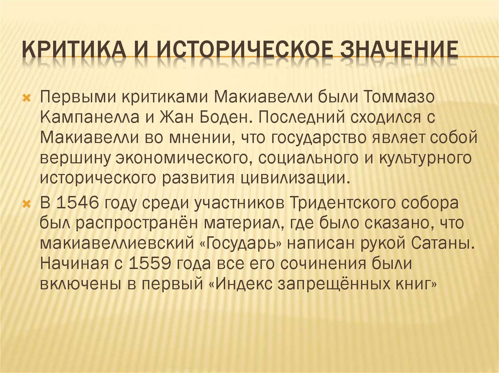 КРИТИКА И ИСТОРИЧЕСКОЕ ЗНАЧЕНИЕПервыми критиками Макиавелли были Томмазо